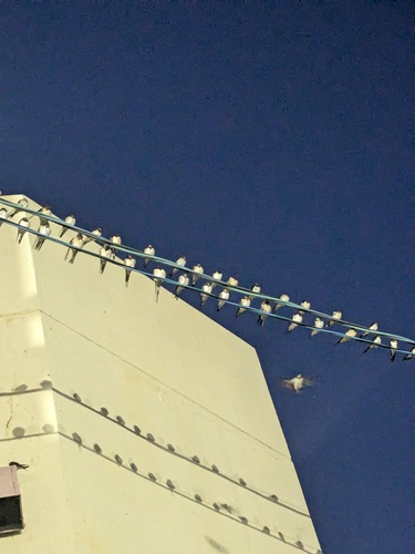 カラスは人から離れたところ木の多い場所をねぐらにするようですが、ムクドリ、ハクセキレイなどは人の近く(しかも夜も明るい場所)をねぐらにすることが多いです。ツバメは渡りの前の集団ねぐらは人の近くの明るいところというイメージはありませんが、今観察している越冬ツバメは夜も明るく車通りも多い場所です。